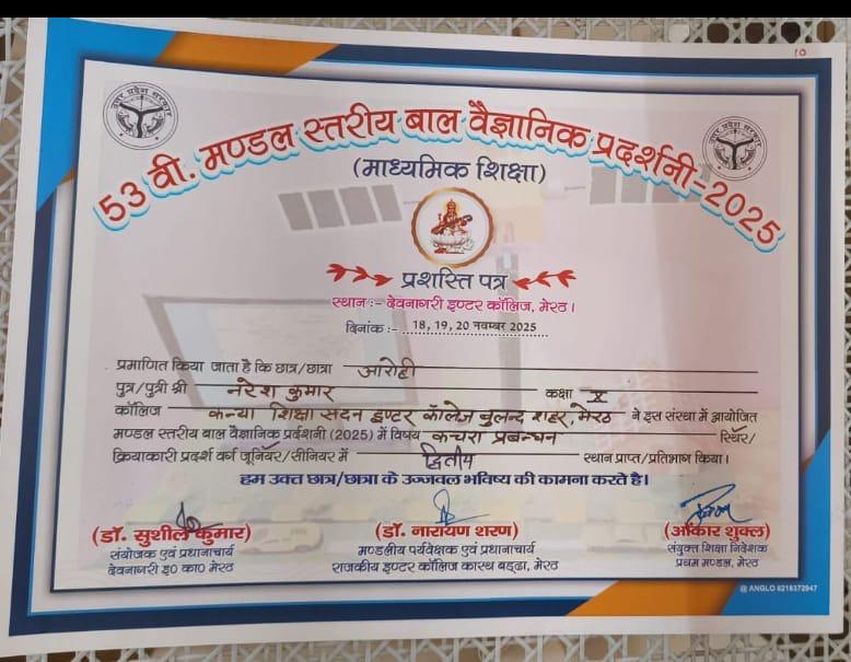 Km Aarohi student of class10th secure 2nd position in 53rd मंडल स्तरीय बाल वैज्ञानिक प्रदर्शनी-2025 in D.N. Inter College Meerut.